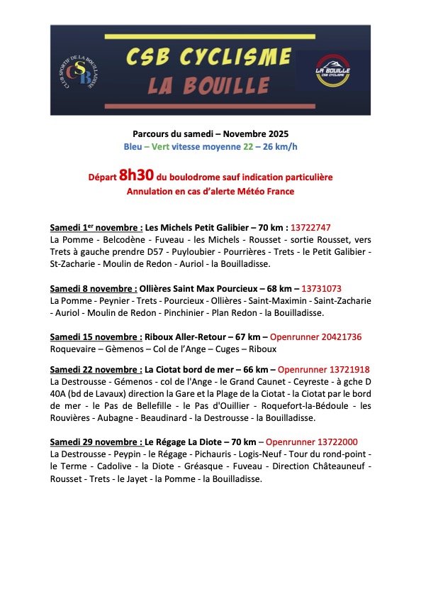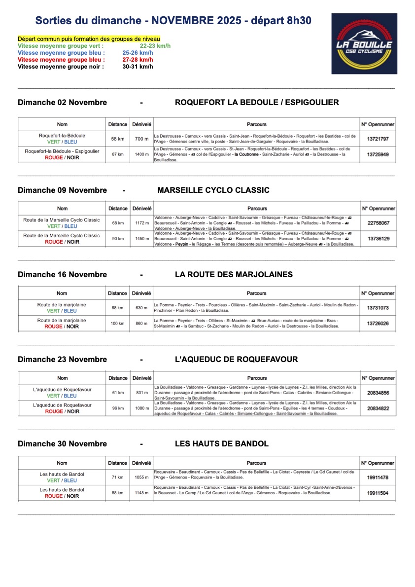 Les choix des parcours sont réalisés de manière réfléchie et prennent en compte les allures moyennes des différents pelotons. Celles-ci bien entendu dépendent des difficultés du jour. Dans les choix faits, beaucoup de paramètres sont pris en compte pour que le groupe, sur un parcours donné, soit rentré pour midi, midi et demi avec les allures suivantes :